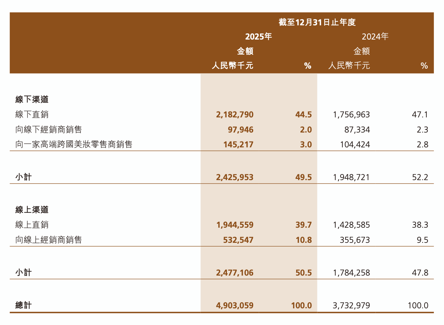 2025年,公司线上渠谈收入24.77亿元(增速38.8%),初次朝上线下渠谈收入24.26亿元(增速24.5%),对应的收入占比差异为50.5%和49.5%。