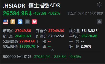 智通财经APP获悉万博manbext体育官网app官网,周四,好意思股三大指数集体下落。恒生指数ADR下落,按比例计较,收报26594.96点,较香港收市跌437.58点或1.62%。